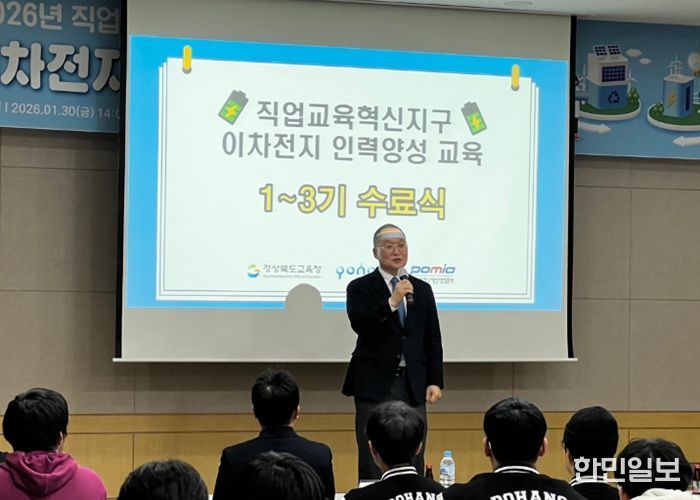한민일보 서울포커스 임경복 기자 | 경북교육청은 30일 포항시에 있는 (재)포항소재산업진흥원(POMIA) 대회의실에서 포항 직업교육 혁신지구 사업의 일환으로 운영한 ‘이차전지 인력양성 교육(중급과정)’ 1~3기 수료식을 개최했다고 밝혔다.