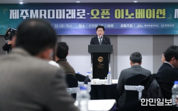 제주도는 30일 오후 3시 제주시 썬호텔에서 한화오션과 공동으로 '제주 MRO 미래로–오픈 이노베이션 세미나'를 개최했다. 오영훈 제주지사와 이상봉 제주도의회 의장, 김광수 교육감, 어성철 한화오션 사장, 신유찬 해군 군수참모부 부장(준장)을 비롯해 산·학·연·관 관계자 100여 명이 참석했다.
