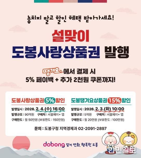 한민일보 서울포커스 김봉순 기자 | 서울 도봉구가 민족 대명절 설을 맞아 90억 원 규모의 도봉사랑상품권과 5억 원 규모의 도봉땡겨요상품권을 발행한다.