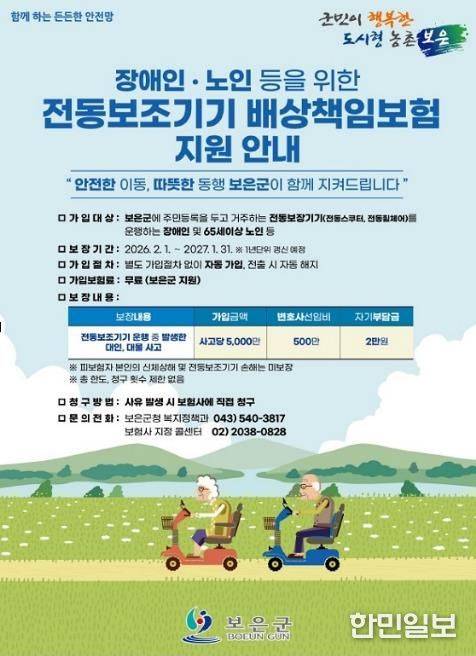 한민일보 서울포커스 김봉순 기자 | 충북 보은군은 전동휠체어와 전동스쿠터를 이용하는 장애인과 65세 이상 노인 등의 안전한 이동을 돕기 위해 지난 1일 처음으로 전동보조기기 배상책임보험을 가입했다고 밝혔다.