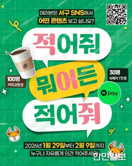 한민일보 서울포커스 김용택 기자 | 인천 서구는 주민과 더욱 효과적으로 소통하고 주민 눈높이에 맞는 콘텐츠를 제작하기 위해 ‘2026년 서구 유튜브·소셜미디어 콘텐츠 선호도 조사’를 오는 1월 29일부터 2월 9일까지 실시한다.