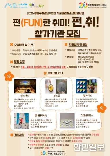 한민일보 서울포커스 김성혜 기자 | 부평구청소년수련관은 2026년 사회배려청소년지원사업 ‘펀(fun)한 취미, 펀.취!’에 참여할 기관을 모집한다고 밝혔다.