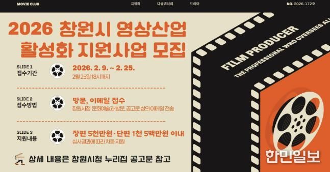 한민일보 서울포커스 김서윤 기자 | 창원특례시는 지역의 문화산업 경쟁력을 강화하고 창원에 기반하고 있는 영상물 제작자들의 창작활동을 지원하기 위해 ‘2026년 영상산업 지원사업’ 공모 접수를 오는 2월 9일부터 2월 25일까지 진행한다고 밝혔다.