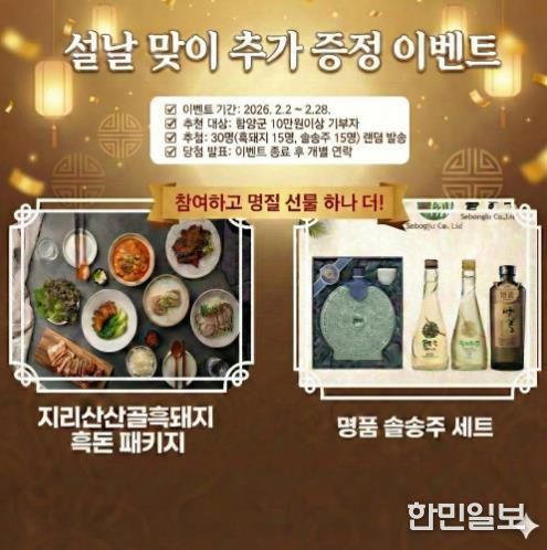 군 관계자는 “설 명절을 맞아 함양을 응원해 주시는 기부자분들께 더 큰 혜택을 드리고자 이번 이벤트를 기획했다”라며, “세액공제와 기본 답례품에 이어 명품 함양 특산물까지 챙길 수 있는 ‘일석삼조’의 기회인 만큼 많은 분의 관심과 참여를 바란다”라고 전했다.