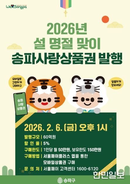 한민일보 서울포커스 박정민 기자 | 서울 송파구가 다가오는 설 명절을 맞이하여 위축된 지역경제 활성화를 도모하고자 ‘송파사랑상품권’과 ‘송파땡겨요상품권’ 발행을 추진한다고 밝혔다.