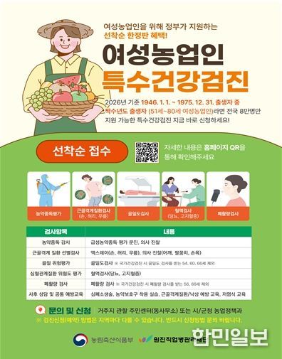 지원 대상은 51세부터 80세까지의 짝수년도 출생 여성농업인으로, 검진비의 10%만 본인이 부담하면 된다. 신청은 거주지 동 주민센터 또는 ‘농업e지’ 앱을 통해 가능하다.