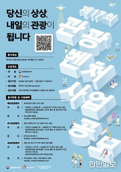 한민일보 서울포커스 임경복 기자 | 문화체육관광부는 한국관광공사와 함께 인공지능(AI)과 디지털 기술을 활용해 한국 관광산업의 미래를 이끌어갈 혁신적인 관광기업을 발굴, 육성하기 위해 2월 3일부터 3월 4일까지 ‘제17회 관광벤처사업 공모전’을 개최한다. 특히 올해 공모전은 인공지능 기술을 접목한 차세대 관광 서비스를 중심으로 유망 기업을 발굴하는 데 초점을 맞춰 진행한다.