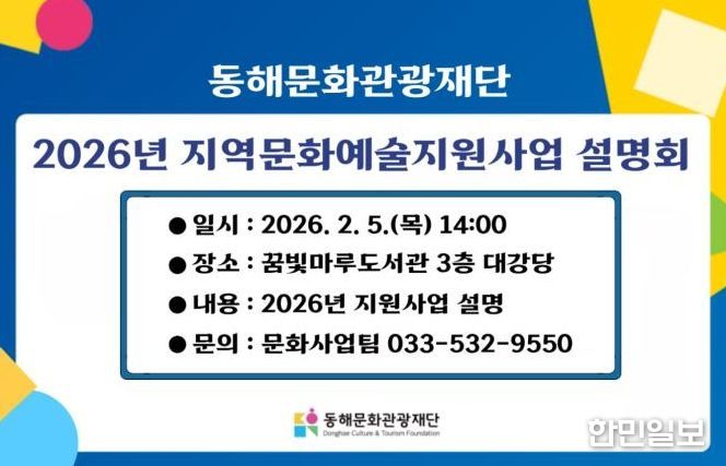 한민일보 서울포커스 임경복 기자 | 동해문화관광재단은 지역 예술단체의 원활한 사업 추진을 지원하기 위해 오는 2월 5일 ‘2026 지역문화예술지원사업 설명회’를 개최한다고 밝혔다.