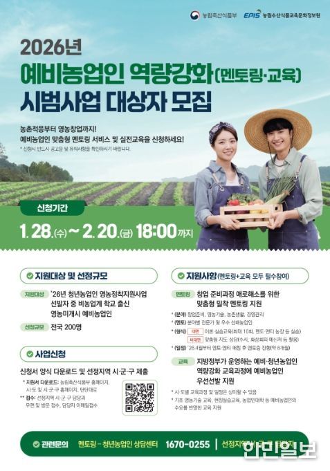 한민일보 서울포커스 박근원 기자 | 경상남도는 청년층의 농업 진입을 지원하기 위해 ‘예비농업인 역량강화 지원사업’을 2026년부터 신규 추진하고, 참여자를 모집한다고 밝혔다.