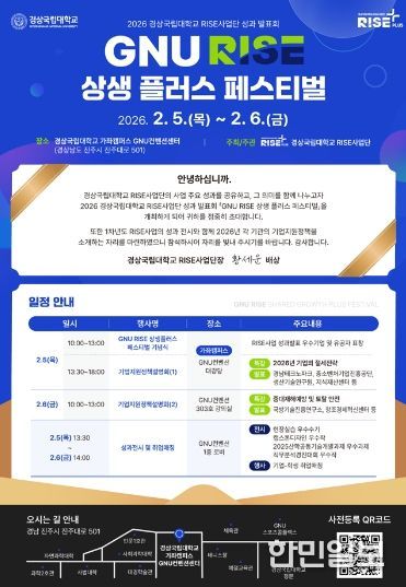 한민일보 서울포커스 박근원 기자 | 경상국립대학교 라이즈(RISE) 사업단(단장 황세운)은 2월 5~6일 가좌캠퍼스 GNU 컨벤션센터 대강당 일원에서 RISE사업의 1차 연도 성과발표회 및 기업지원정책 설명회 ‘GNU RISE 상생 플러스 페스티벌’을 개최한다.