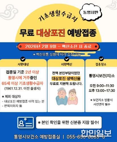 한민일보 서울포커스 김서윤 기자 | 통영시는 오는 9일부터 관내 65세 이상 기초생활수급자를 대상으로 무료 대상포진 예방접종을 실시한다.