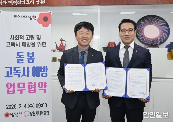 한민일보 서울포커스 박용남 기자 | 남원시는 사회적 고립 및 고독사 예방을 위한 지역 돌봄 체계 강화를 위해 2월 4일 시장실에서 남원시니어클럽(관장 김현성)과 업무협약을 체결했다.