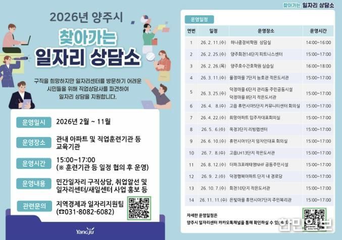 한민일보 서울포커스 차재만 기자 | 양주시가 구직 현장의 문턱을 낮추고 시민들의 취업 성공률을 높이기 위해 오는 11월까지 ‘2026년 찾아가는 일자리 상담소' 를 운영한다.