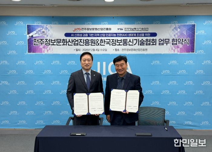 한민일보 서울포커스 김용택 기자 | 전주시 출연기관인 전주정보문화산업진흥원은 4일 진흥원 멀티미디어기술지원센터 1층 세미나실에서 한국정보통신기술협회와 AI 신뢰성 검증 기반 지역 산업 인공지능 디지털 전환(AX) 생태계 조성을 위한 업무협약을 체결했다.