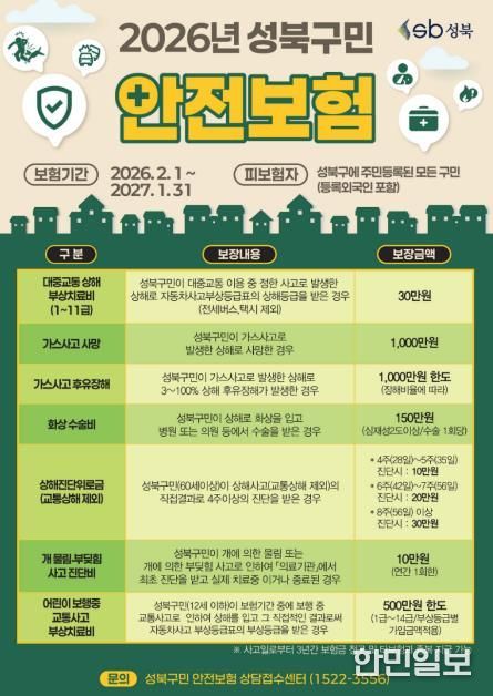 한민일보 서울포커스 김봉순 기자 | 서울 성북구가 재난과 각종 사고로 피해를 입은 구민의 생활 안정을 지원하기 위해 ‘2026년 성북구민 안전보험’을 2월 1일부터 시행했다.