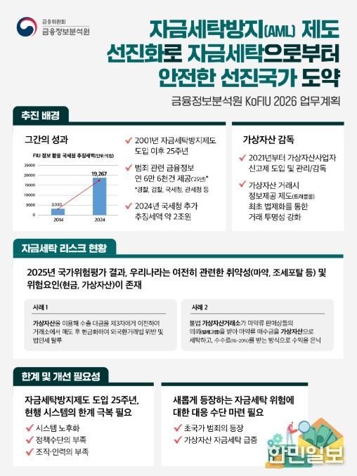 최근 국내외 환경 변화로 시급한 과제로 떠오른 AML 제도 보완을 위해 신속하고 효과적인 자금세탁 범죄수익 동결 및 환수를 위한 전면적인 제도 개편, 자금세탁 리스크의 일선 대응 주체인 금융업권의 AML 역량 강화, 국제기준에 대한 정합성 제고 등 현안 과제를 담은 2026년 업무 수행계획을 마련했다.