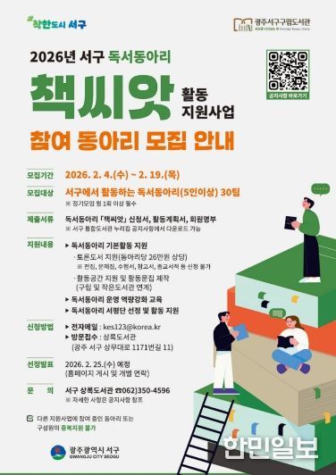 김이강 서구청장은 “주민들이 함께 읽고 함께 나누는 생활 독서가 일상에 자리 잡을 수 있도록 독서동아리 ‘책씨앗’ 사업을 지속적으로 추진하겠다”며 “올해도 많은 독서동아리가 적극 참여해 주길 바란다”고 말했다.