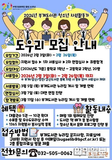 한민일보 서울포커스 김성혜 기자 | 부평구립 부개도서관은 오는 26일까지 청소년 자원활동가 ‘도우리’를 모집한다.