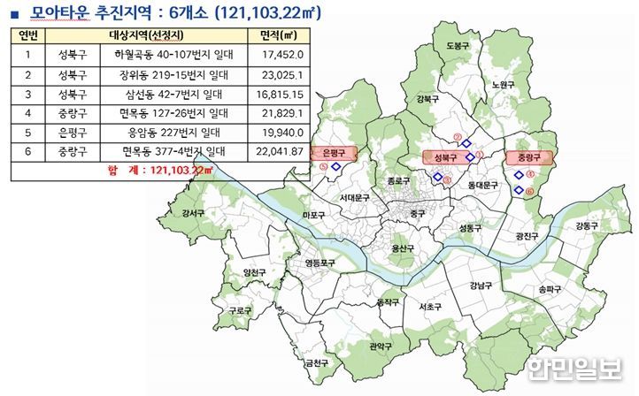 서울시는 2월 4일 제2차 도시계획위원회에서 주민제안 모아타운 신규 신청지역 6곳(성북구 3곳, 중랑구 2곳, 은평구 1곳)의 지목 도로를 토지거래허가구역으로 신규 지정했다고 밝혔다. 지정기간은 2월 17일부터 2031년 2월 16일까지 5년간이다.