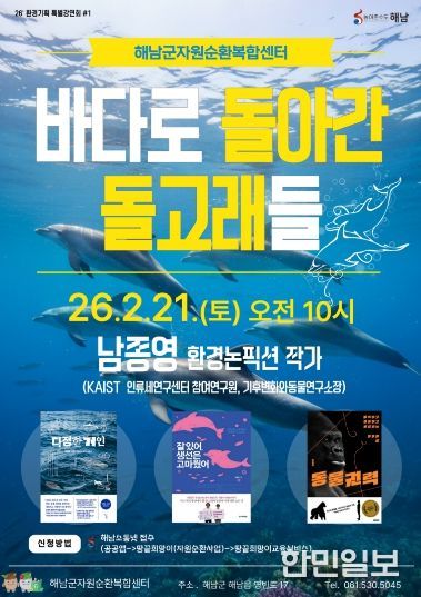 한민일보 서울포커스 박용남 기자 | 해남군자원순환복합센터는 오는 21일 환경논픽션 작가 남종영을 초청해 ‘바다로 돌아간 돌고래들’특별강연을 개최한다.