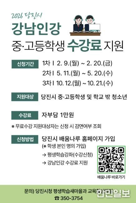 한민일보 서울포커스 임경복 기자 | 당진시는 사교육비로 인한 부모들의 경제적 부담 덜기 위해 당진시 중고등학생과 학교 밖 청소년을 대상으로 ‘강남인강’ 수강료를 지원한다고 6일 밝혔다.