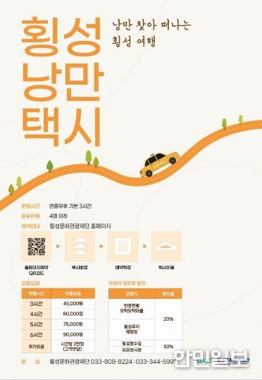 한편, 낭만택시 이용 방법과 상세한 할인 일정은 향후 횡성문화관광재단 누리집(홈페이지)을 통해 공지될 예정이다.