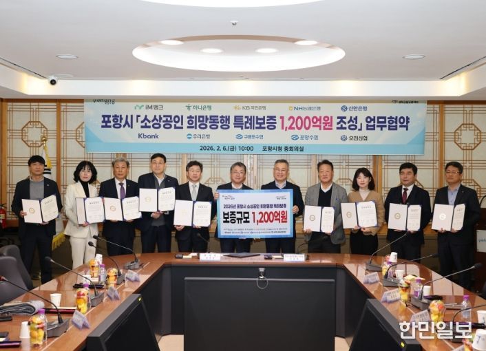 한민일보 서울포커스 임철현 기자 | 포항시는 자금 조달에 어려움을 겪는 소상공인을 지원하기 위해 6일 경북신용보증재단 및 협약 금융기관과 총 1,200억 원 규모의 ‘희망동행 특례보증재원’ 조성을 위한 업무협약(MOU)을 체결했다.