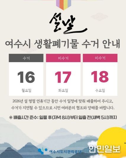 한민일보 서울포커스 임광현 기자 | 여수시도시관리공단(이사장 송병구)은 2026년 설 명절을 앞두고 귀성객과 관광객이 증가할 것으로 예상됨에 따라, 쾌적하고 깨끗한 도시환경 조성을 위해 여수시 전역을 대상으로 '설 명절 대비 청소종합 대책'을 시행한다고 6일 밝혔다.