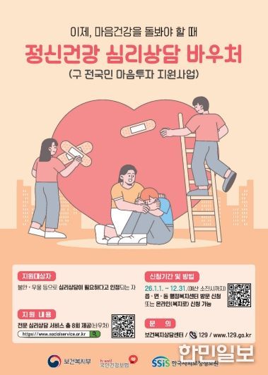 신청은 예산 소진 시까지 연중 가능하며, 신분증과 관련 증빙서류를 지참해 거주지 동주민센터를 방문하거나, 만 19세 이상 성인은 ‘복지로’ 누리집을 통해 온라인 신청할 수 있다. 선정 후에는 주소지와 관계없이 원하는 제공기관을 선택해 상담을 받을 수 있다.