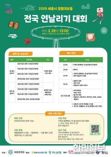 세종특별자치시는 세종문화원 주관으로 ‘2026년 세종시 정월대보름 전국 연날리기 대회’ 참여자를 모집한다고 밝혔다.