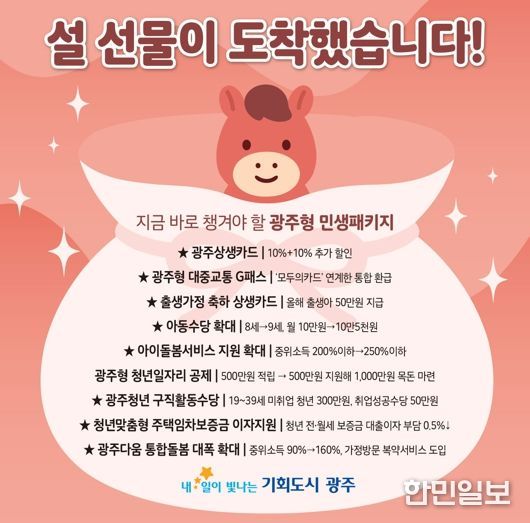 한민일보 서울포커스 임경복 기자 | 광주광역시가 시민들의 생활비 부담을 덜고 일상에 활력을 불어넣을 ‘설 선물 같은 정책’을 잇따라 선보이고 있다.