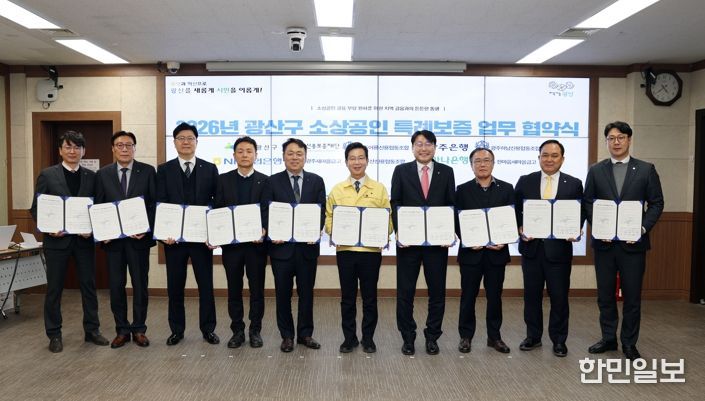 한민일보 서울포커스 임경복 기자 | 광주 광산구가 6일 구청 2층 회의실에서 광주신용보증재단, 지역 금융기관 8개소(△광주어룡신협·광주하남신협·우산신협 △광주은행 △하나은행 △농협△서광주새마을금고·한마음새마을금고)와 함께 ‘2026년 광산구 소상공인 특례보증 업무협약’을 체결했다.