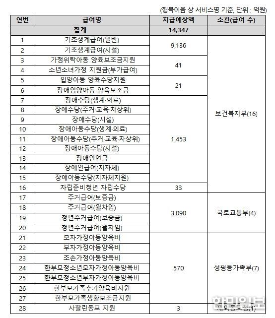 조기지급 대상은 생계급여와 주거급여를 비롯해 장애수당·장애인연금, 입양아동 양육수당, 자립준비청년 자립수당, 가정위탁아동 양육수당, 한부모가족 지원, 사할린동포 지원 등 총 4개 부처 소관 28종 복지급여로, 보건복지부·국토교통부·성평등가족부·재외동포청이 함께 참여한다.