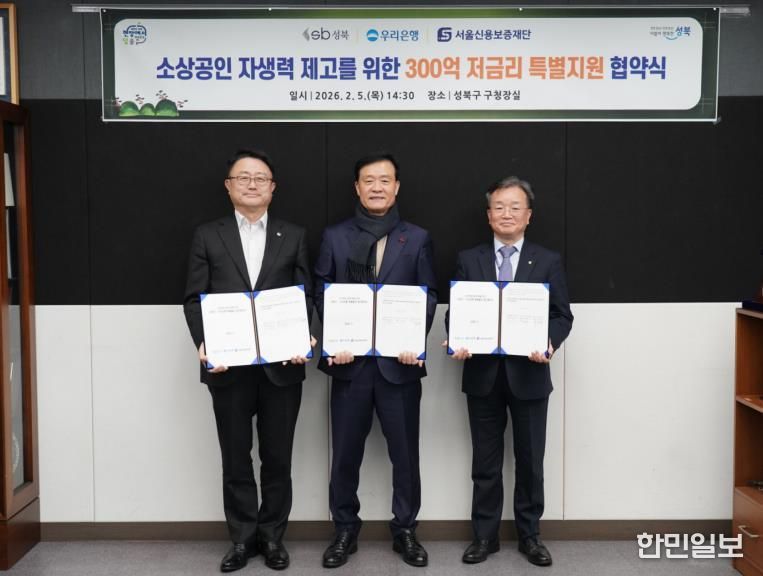 한민일보 서울포커스 김봉순 기자 | 서울 성북구가 지난 5일 우리은행, 서울신용보증재단과 함께 ‘소상공인 특별융자 지원 업무협약’을 체결했다.