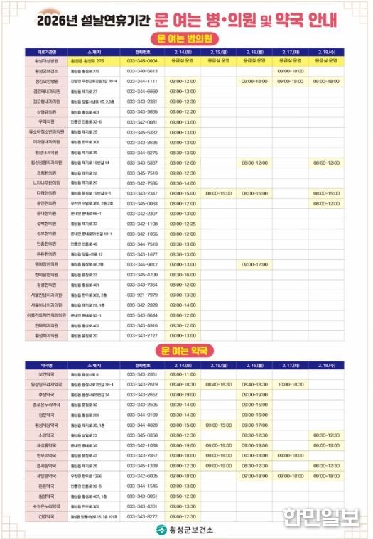 한민일보 서울포커스 진광성 기자 | 횡성군은 설 연휴 기간(2.14.~2.18.) 중 의료공백을 최소화하고 응급상황에 신속하게 대응하기 위해 응급진료체계를 정상 운영 한다고 밝혔다.