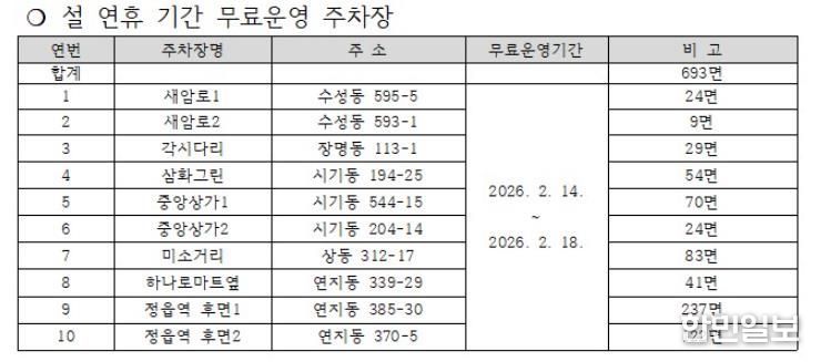 한민일보 서울포커스 김용택 기자 | 정읍시가 다가오는 설 연휴 기간인 14일부터 18일까지 5일간 관내 유료 공영주차장 10개소를 전면 무료 개방한다.
