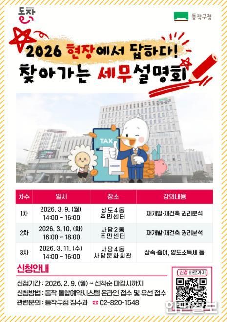 한민일보 서울포커스 곽중희 기자 | 동작구가 재개발·재건축이 활발히 진행되는 구 특성을 반영해 ‘2026 현장에서 답하다! 찾아가는 세무설명회’를 개최한다고 밝혔다.