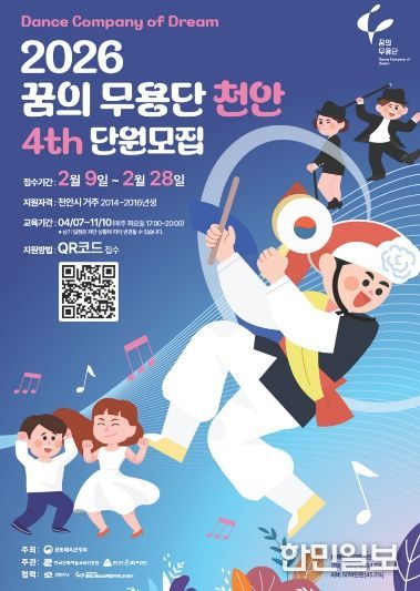 한민일보 서울포커스 황준형 기자 | 천안문화재단이 지역 아동의 예술적 감수성과 협업 역량을 키우는 ‘2026 꿈의 무용단 천안’ 단원을 9일부터 28일까지 모집한다.