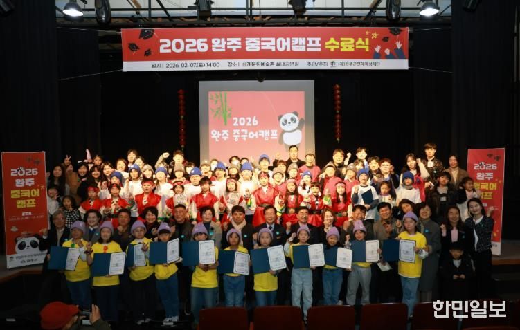 이번 수료식은 초등학교 2학년부터 중학교 1학년까지 학생 43명이 참여한 중국어캠프의 교육 성과를 공유하는 자리로, 유희태 완주군수와 유의식 군의회 의장, 재단 이사, 학부모 등 100여 명이 참석해 학생들의 성장을 함께 축하했다.