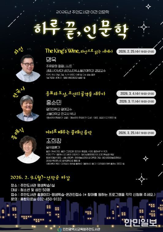 한민일보 서울포커스 유창렬 기자 | 인천광역시교육청주안도서관은 2월부터 3월까지 시민들이 다양한 인문학 주제를 접할 수 있는 야간 인문학 프로그램 ‘하루 끝, 인문학’을 운영한다.
