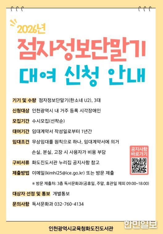 한민일보 서울포커스 유창렬 기자 | 인천광역시교육청화도진도서관은 인천 거주 시각장애인을 대상으로 ‘점자정보단말기 무상대여 사업’을 운영한다고 9일 밝혔다.