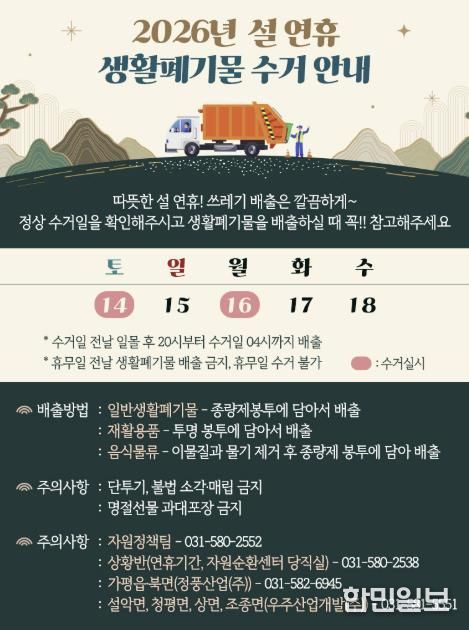 한민일보 서울포커스 최성훈 기자 | 가평군은 설 명절을 맞아 군민과 방문객 모두가 쾌적한 환경에서 청결한 연휴를 보낼 수 있도록 생활폐기물 처리 대책을 마련했다.