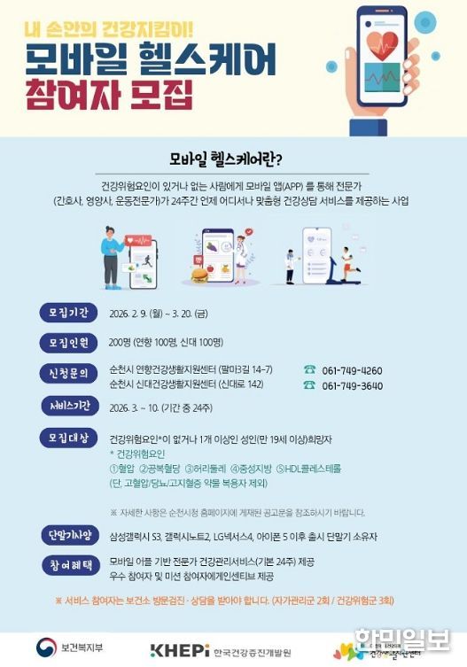 한민일보 서울포커스 임광현 기자 | 순천시는 ICT 기반 공공형 건강관리서비스인 ‘2026년 보건소 모바일 헬스케어 사업’ 참여자를 모집한다고 밝혔다.