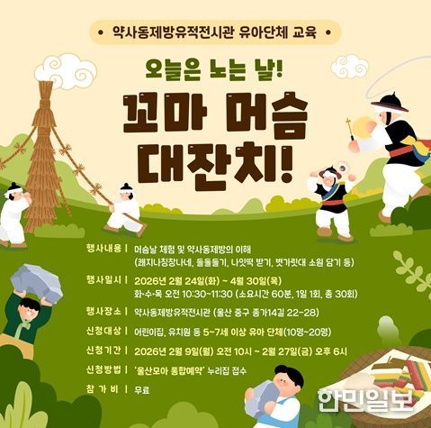 한민일보 서울포커스 임경복 기자 | 울산 약사동제방유적전시관이 관내 어린이집과 유치원 원아(5세~7세)를 대상으로 머슴날(음력 2월 1일)과 관련한 교육 프로그램 ‘오늘은 노는 날! 꼬마 머슴 대잔치!’를 운영한다.