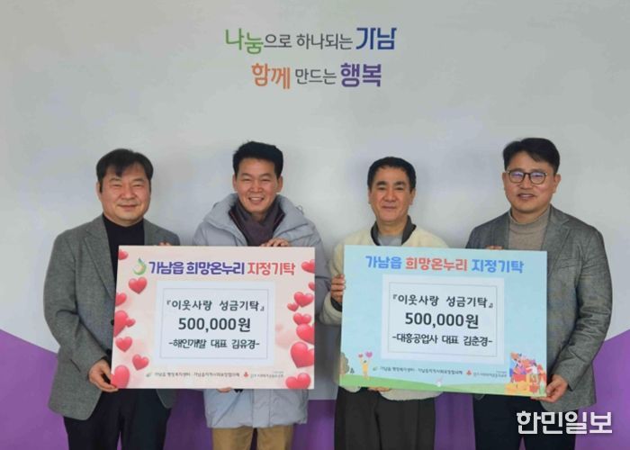 한민일보 서울포커스 전희주 기자 | 여주시 가남읍 행정복지센터는 지난 9일, 해인개발과 대흥공업사에서 관내 어려운 이웃을 위한 성금 각 50만 원을 기탁하고, ‘가남읍 희망온누리’ 정기기부에 신규 참여했다고 밝혔다.