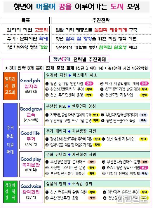 문화 측면에서는 ‘부산청년만원+문화패스’를 개편해 신설 공연장과의 연계 등 청년들의 선택권을 넓히고, 전문가 초청 금융교육을 정례화해 경제적 자립을 돕는다.