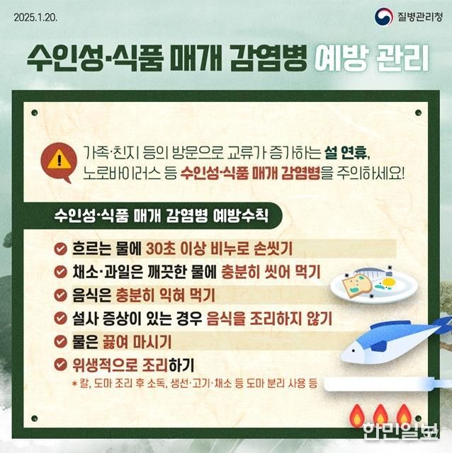 겨울철에 주로 발생하는 노로바이러스 감염증이 최근 영유아(0~6세)와 학생을 중심으로 지속적으로 발생하고 있어 각별한 주의가 요구된다. 노로바이러스는 오염된 음식물뿐만 아니라 환자와의 접촉, 비말 등을 통해서도 전파될 수 있어 많은 사람이 모이는 명절에 확산 위험이 더 높아진다. 파주보건소는 관내 어린이집, 사회복지시설 등 감염 취약시설에 예방수칙 안내문을 배포하고, 위생 관리를 철저히 해줄 것을 당부했다.