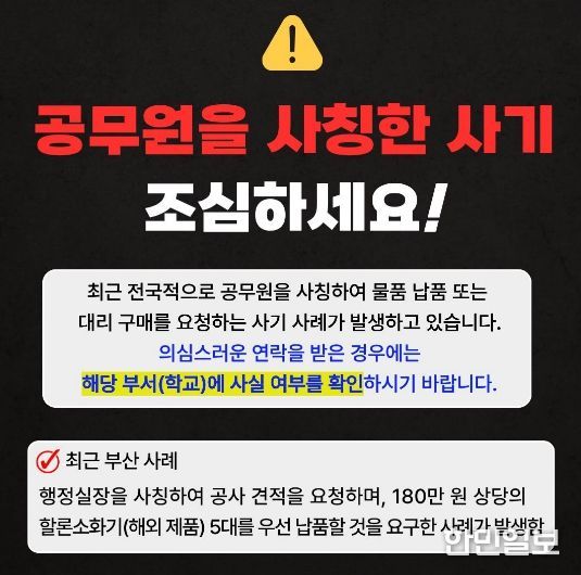 교육청 관계자는 “학교나 교육청은 어떠한 경우에도 업체에 물품 대리 구매를 요구하거나 개인 계좌로 대금 송금을 유도하지 않는다”며, “학교 관계자라며 연락이 오더라도 반드시 기관 공식 전화번호로 사실 여부를 재확인달라”고 당부했다.
