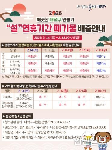 한편, 구는 설 연휴 생활 쓰레기 수거 일정을 대덕구 누리집, 카드뉴스, 네이버 블로그․밴드 등을 활용해 사전 홍보하며 각 가정에서 쓰레기 배출로 인한 불편이 발생하지 않도록 안내에 나서고 있다.