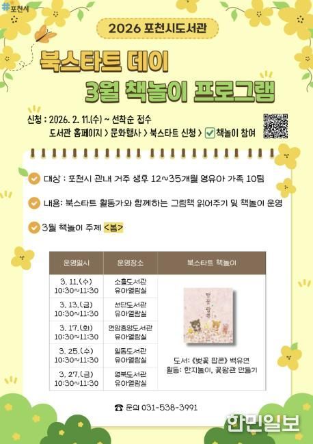 이와 함께 포천시는 오는 3월부터 ‘북스타트 데이’ 책놀이 프로그램도 운영한다. 해당 프로그램은 포천시 도서관 5개소(면암중앙·소흘·일동·영북·선단)에서 관내 12~35개월 영유아를 대상으로 진행된다. 북스타트 활동가와 함께 주제별 그림책 읽기와 연계한 책놀이 활동을 통해 영유아의 정서 발달과 부모·자녀 간 교감을 돕는다.